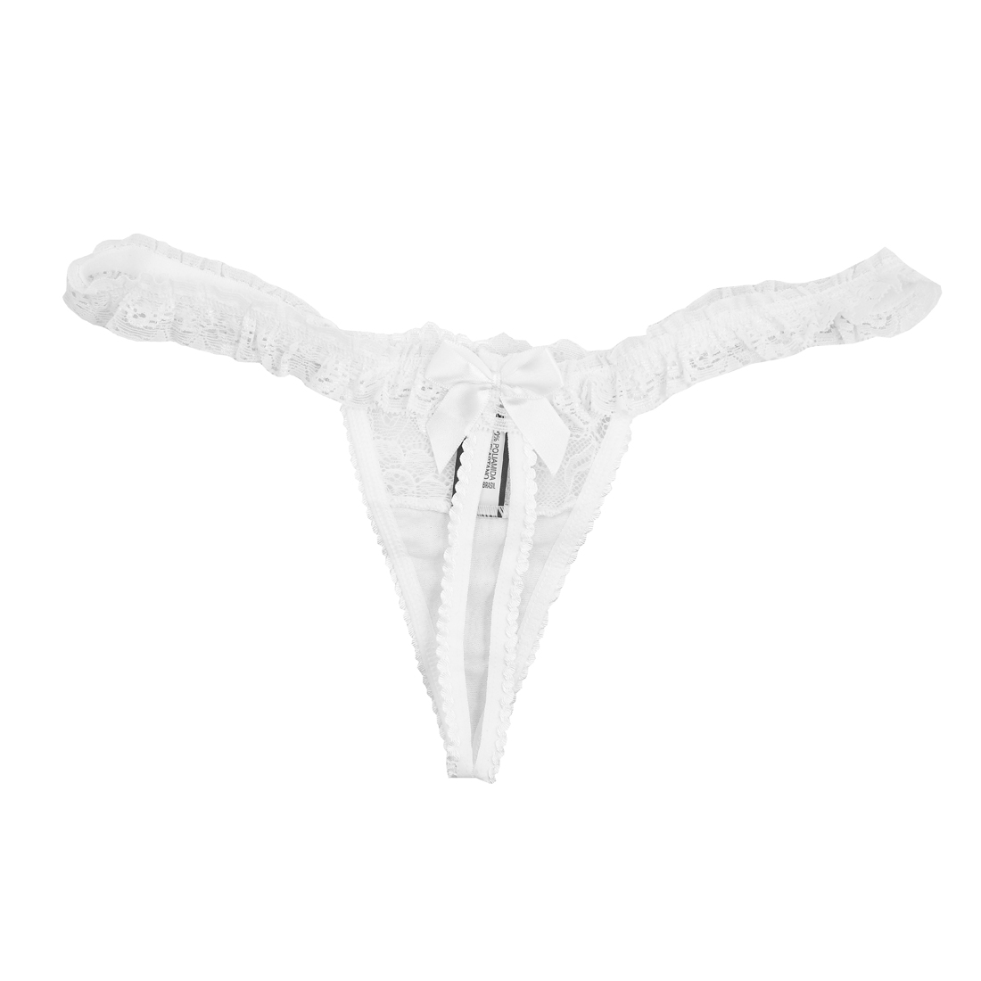 Tanga fio dental com renda na parte frontal e babados nas laterais. Possui um pequeno laço no bumbum. Tamanho: único. Cor: Branca. Composição: 90% poliamida, 10% elastano. Forro: 100% algodão. Confeccionado por: Erótika Lingerie.