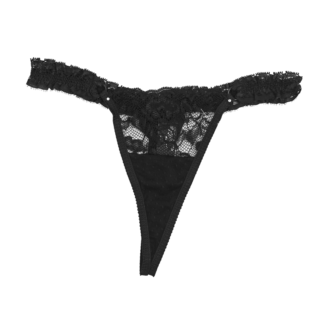 Tanga fio dental com renda na parte frontal e babados nas laterais. Possui um pequeno laço no bumbum. Tamanho: único. Cor: Preta. Composição: 90% poliamida, 10% elastano. Forro: 100% algodão. Confeccionado por: Erótika Lingerie.